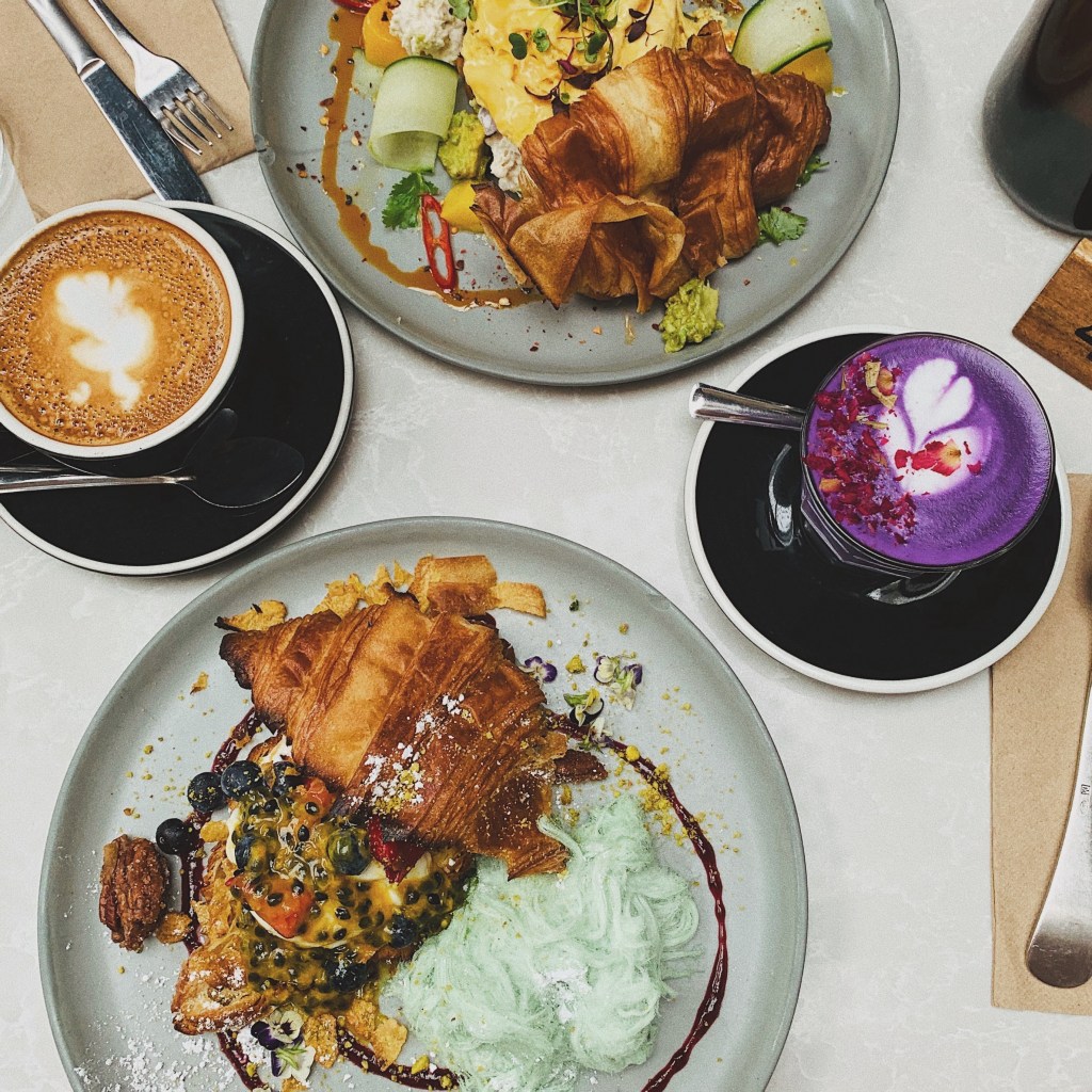 Purple latte-還點了一杯好可愛的拿鐵 配可頌 本來完全是抱著喝一口就不會再喝的心態 但出乎我意料 就是拿鐵 還帶點花香 不會太甜