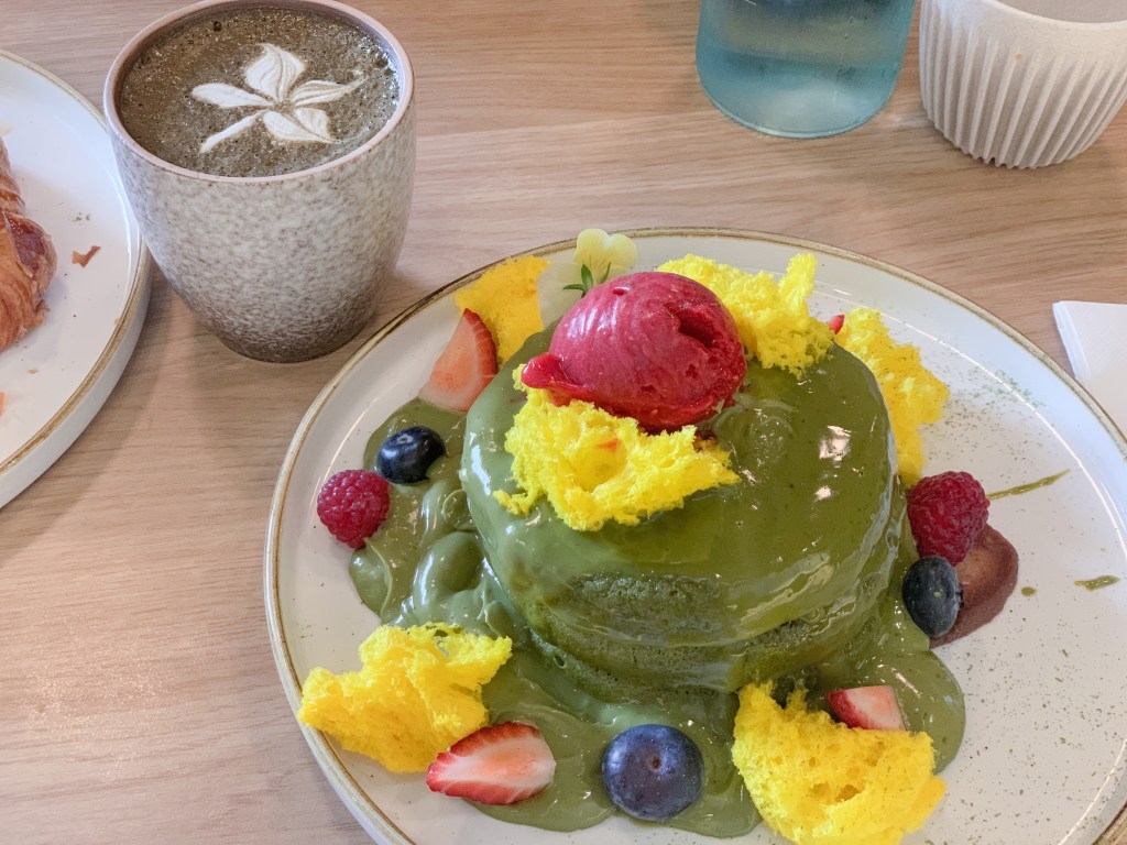 招牌抹茶鬆餅:鬆餅本人 真的不是我的菜 是屬於比較厚比較濕潤的那種口感 但外面淋的抹茶醬 真的超喜歡 是偏大人的口味的抹茶 想像得到嗎!?就是有茶香不會假的只剩死甜 所以我吃了3/1塊鬆餅 但把抹茶醬都給沾完了😂😂 鬆餅裡面有紅豆夾心 不會太甜不會太膩
